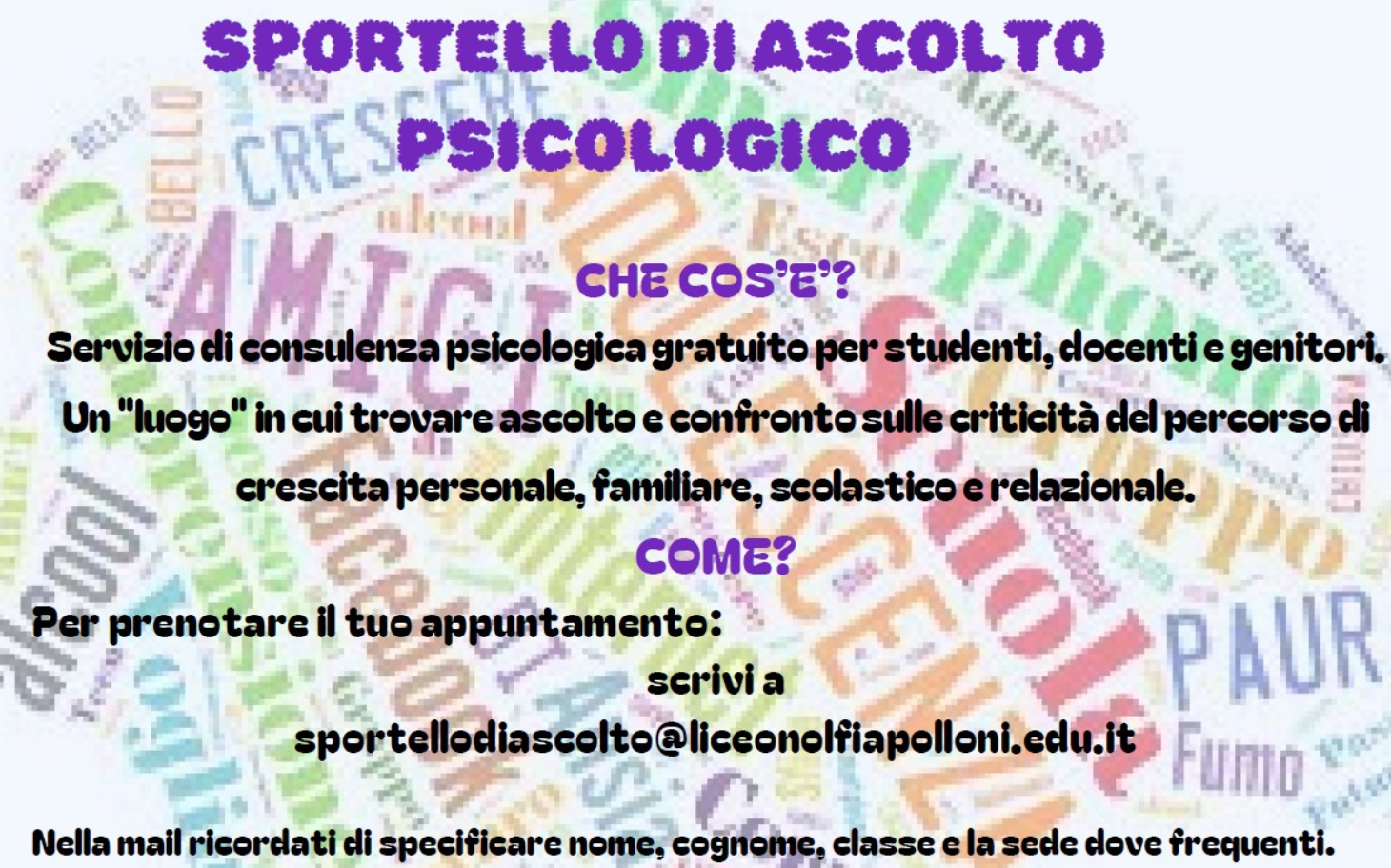 Email Subscribe All SPORTELLO D'ASCOLTO PSICOLOGICO SPORTELLO D'ASCOLTO PSICOLOGICO FileDescrizioneVersioneDimensioneData inserimentoDownload modulo consenso informato (1) 17.05 KB26-04-2026 Download locandina 1.94 MB26-04-2026 Download _sigillo_87. Sportello dâ__ascolto â__ Funzionamento-signed 308.78 KB26-04-2026 Download